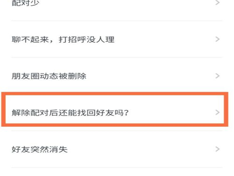 5、选择“解除配对后还能找回好友吗”即可知道答案。
