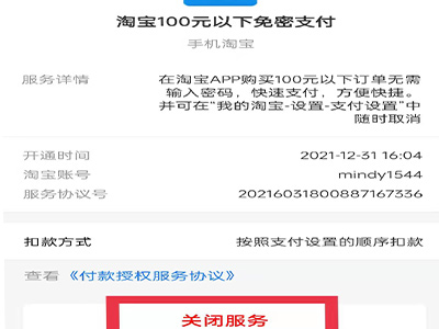 在淘宝设置页面选择支付,选择并进入小额免密支付页面,选择关闭服务即可取消免密支付功能。免密支付指支付一定金额时,不用输入密码即可完成交易。取消淘宝免密支付功能的具体操作方法如下: