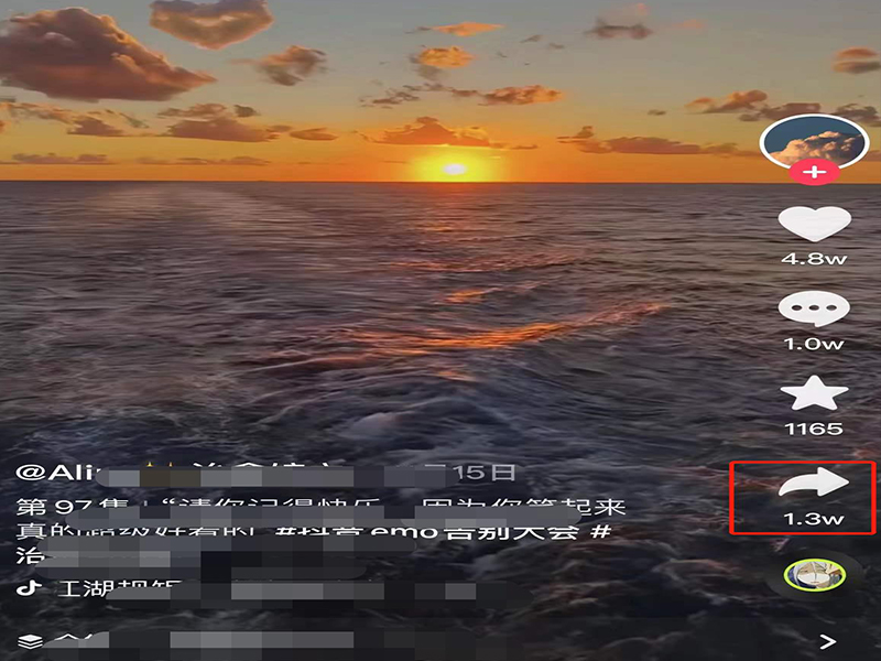 1、打开抖音app,在视频播放页面,点击右侧的右转箭头图标,即弹出视频工具栏。