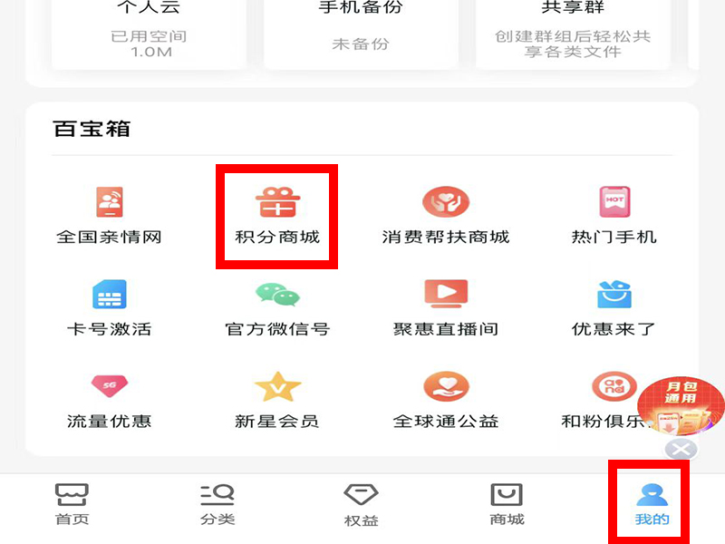 1、打开中国移动app,点击进入“我的”的界面,拖动屏幕往下滑,找到“积分商城”。