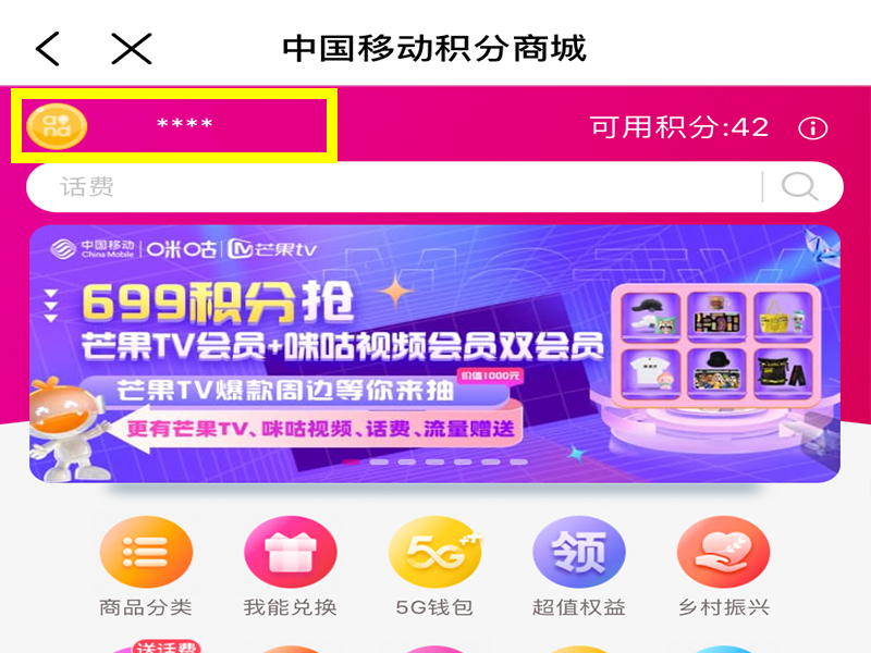 2、进入“积分商城”界面后,点击左上方的手机号码。