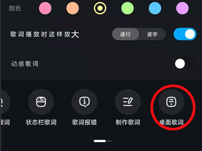 4、向右滑动最后一行,点击 “桌面歌词”。