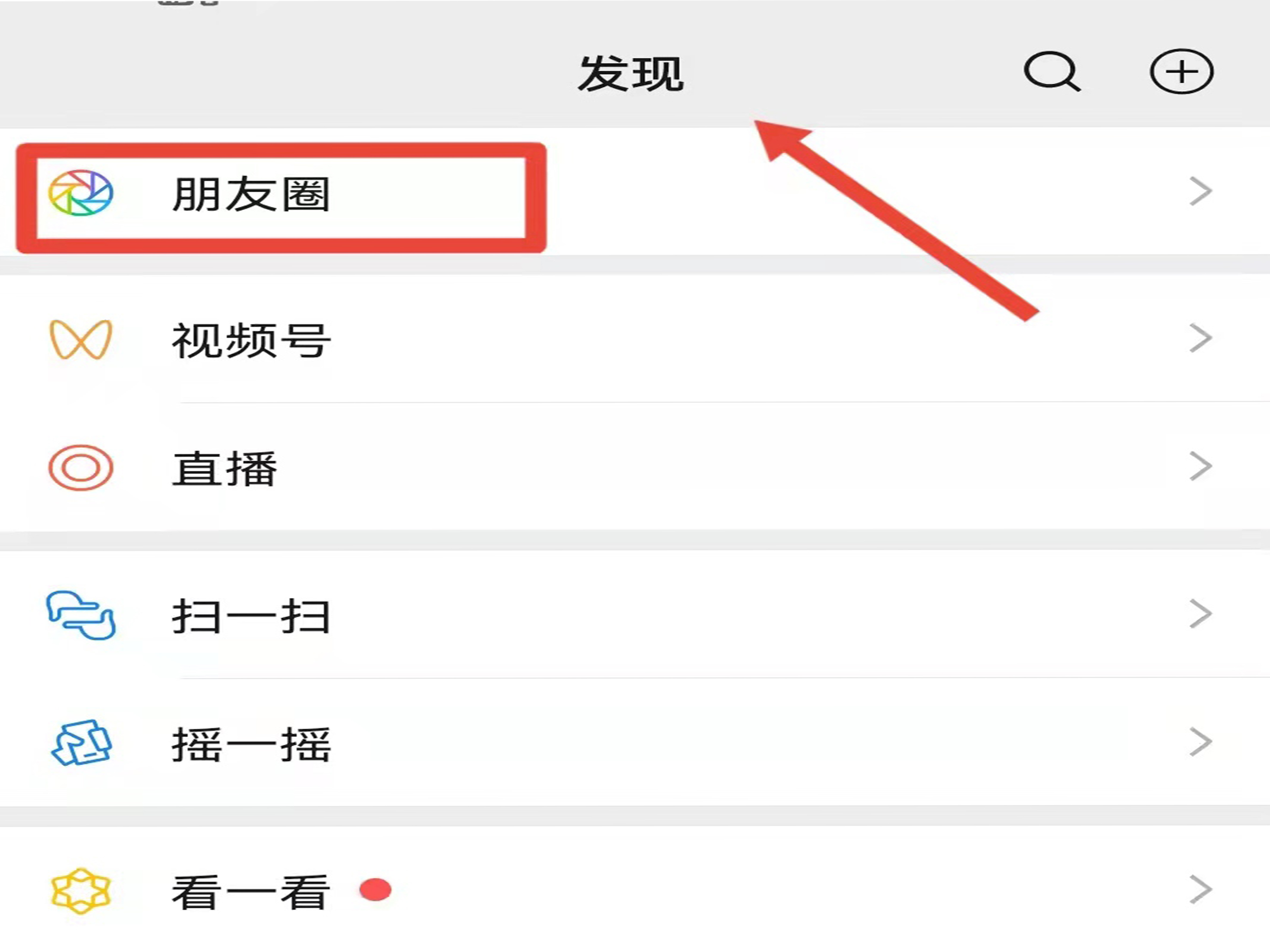 1、打开微信app,切换至“发现”页面,点击进入“朋友圈”。