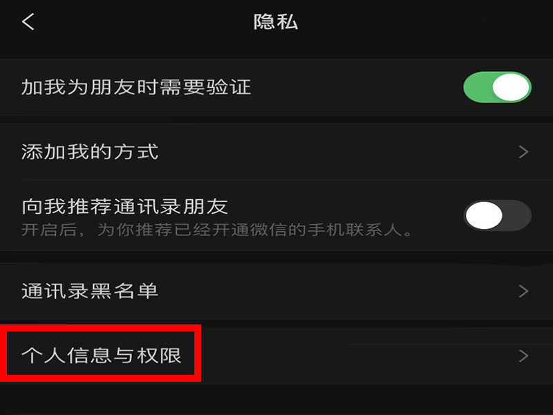 2、进入“隐私”界面后,点击“个人信息与权限”。