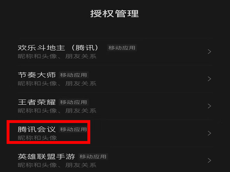 4、进入“授权管理”界面后,找到腾讯视频,并将腾讯会议取消授权。