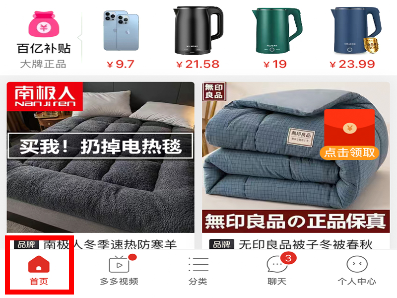 2、在“首页”界面上方的搜索栏中搜索想要的商品。