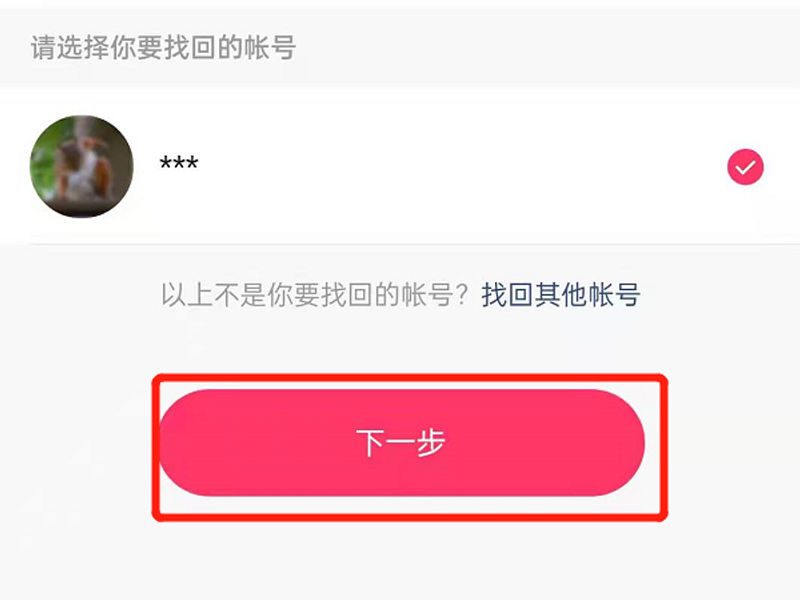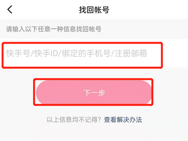 4、输入快手号、快手ID、绑定的手机号、注册邮箱其中之一,点击“下一步”,确认账号,再点击“下一步”。