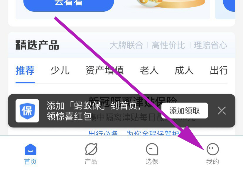 2、在蚂蚁保的主页中,点击右下角“我的”图标。
