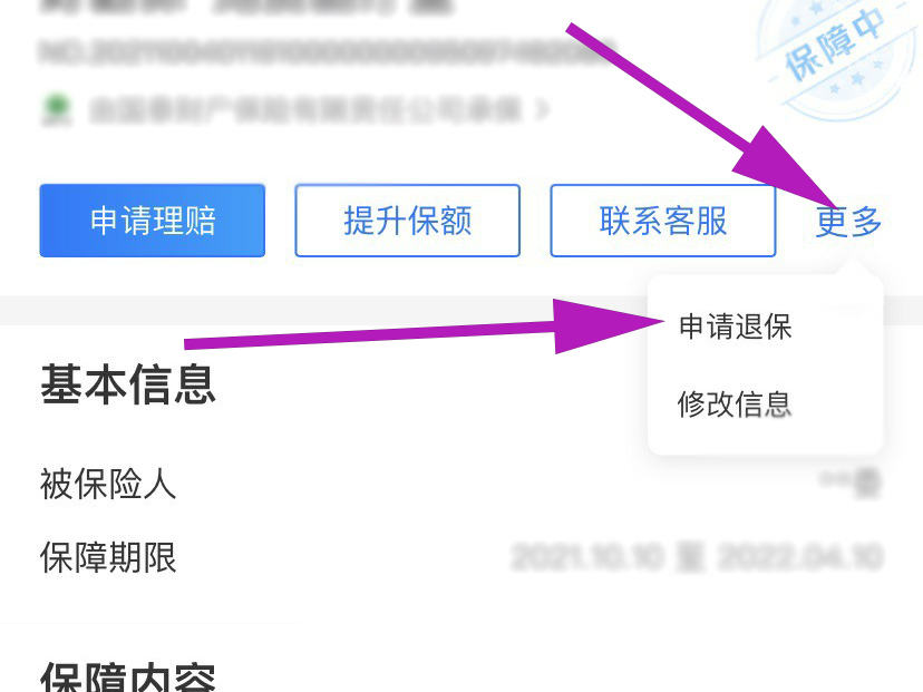 4、选择并且进入要关闭保险的页面,然后在保险的页面中点击“更多”选项,然后点击申请退保,即可退出该保险。
