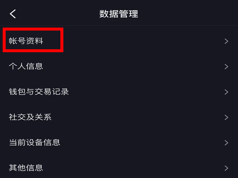 4、进入“数据管理”界面后,点击“账号资料”。
