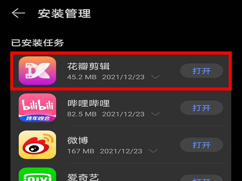 4、进入“安装管理”界面后,在“已安装任务”中就可以看到“花瓣剪辑”了。