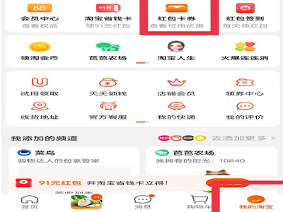 1、打开手机淘宝,选择“我的淘宝”,在“必备工具”中点击“红包卡券”。