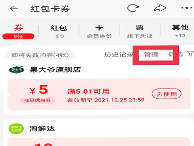 2、点击“优惠券”,点击优惠券页面右上角的“管理”。