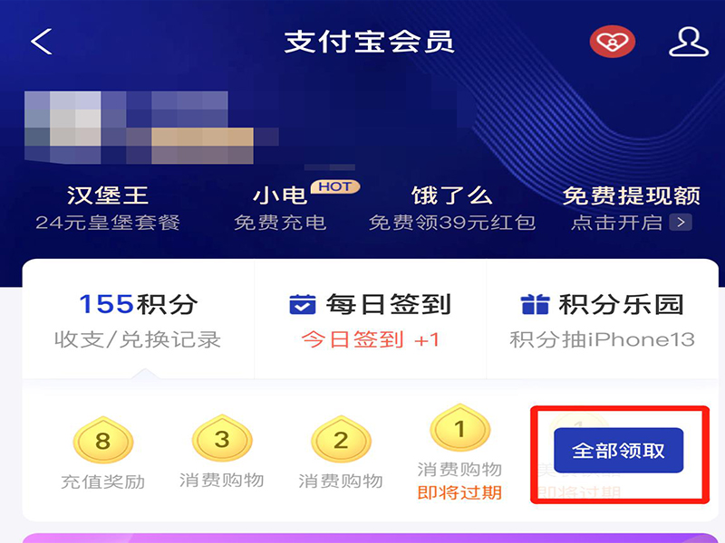 2、点击“全部领取”支付宝积分。