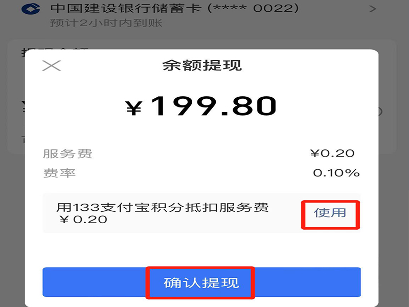 5、选择使用支付宝积分抵扣服务费,并点击“确认提现”即可。