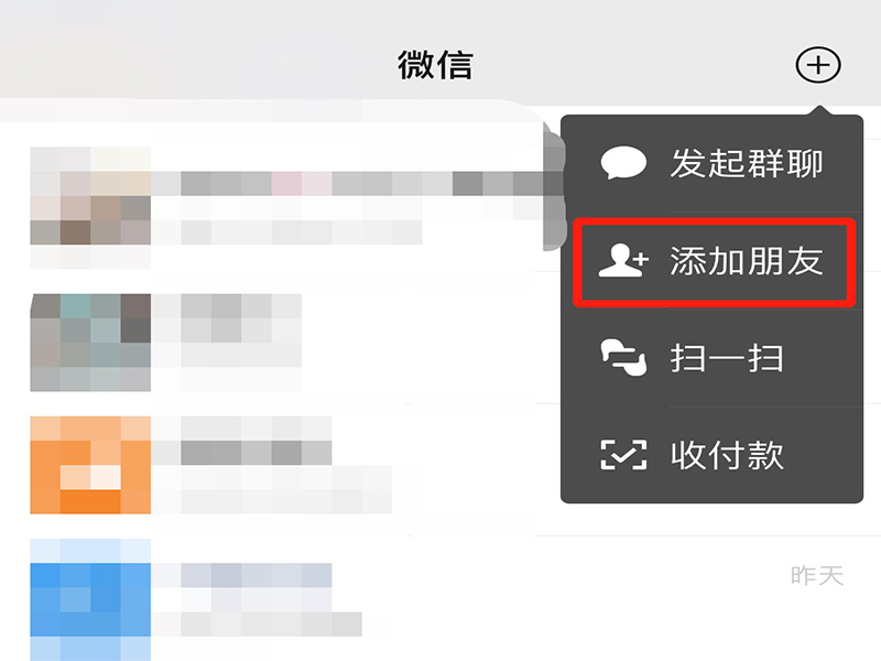 1、打开微信APP,点击右上角“+”按键,选择添加朋友。