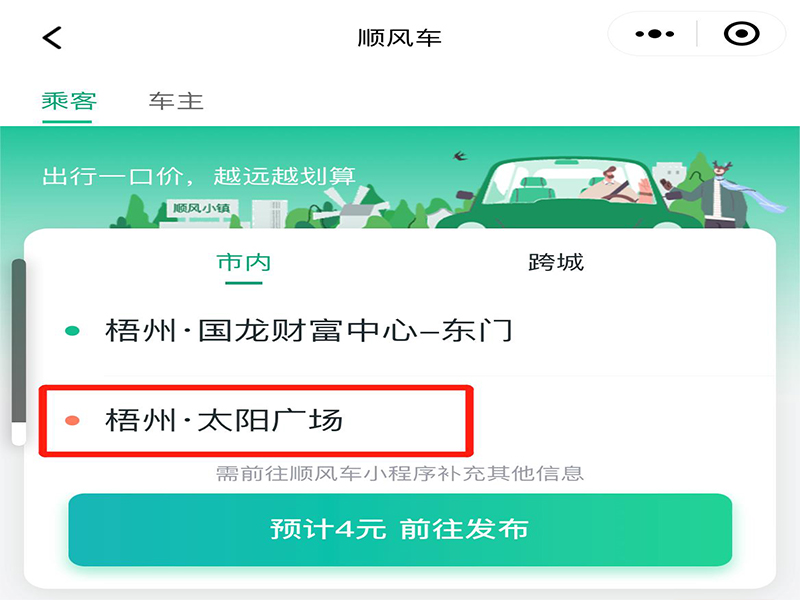 顺风车可以通过微信里的滴滴出行小程序打车,只要进入顺风车板块输入目的地地址、人数、时间等信息就可以呼叫顺风车,具体操作如下:
