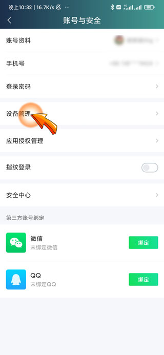 3、然后点击账号与安全页面中的“设备管理”选项。