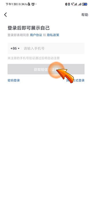 1、注册抖音账号首先需要打开抖音APP,输入自己需要注册的手机号,点击下方的“获取短信验证码”的选项。